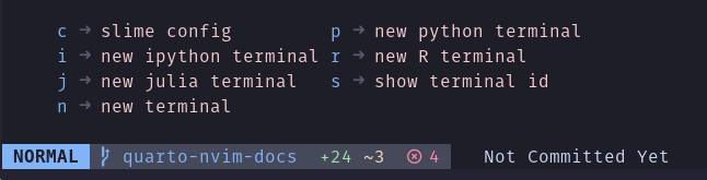 The Quarto Neovim plugin aims to not reinvent the wheel. Existing plugins in the Neovim ecosystem are leveraged to provide the full experience. Some of the features provided by quarto-nvim